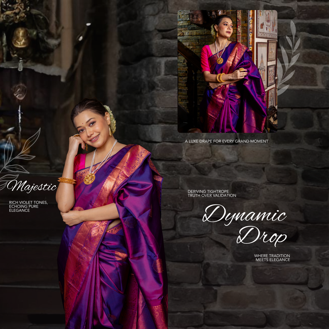 Own a piece of wearable heritage with the Regal Violet Kanjivaram Silk...