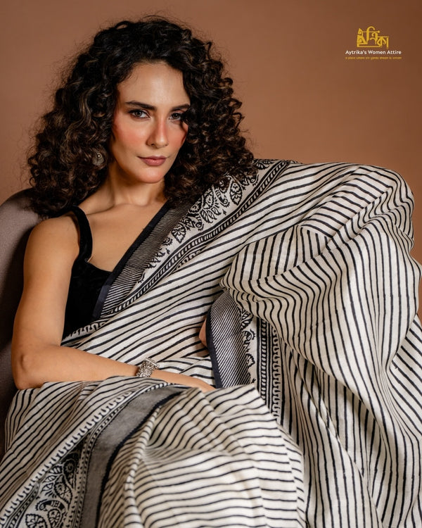 Midnight Stripe Hand Block Print Saree: A Study in Linear Sophistication