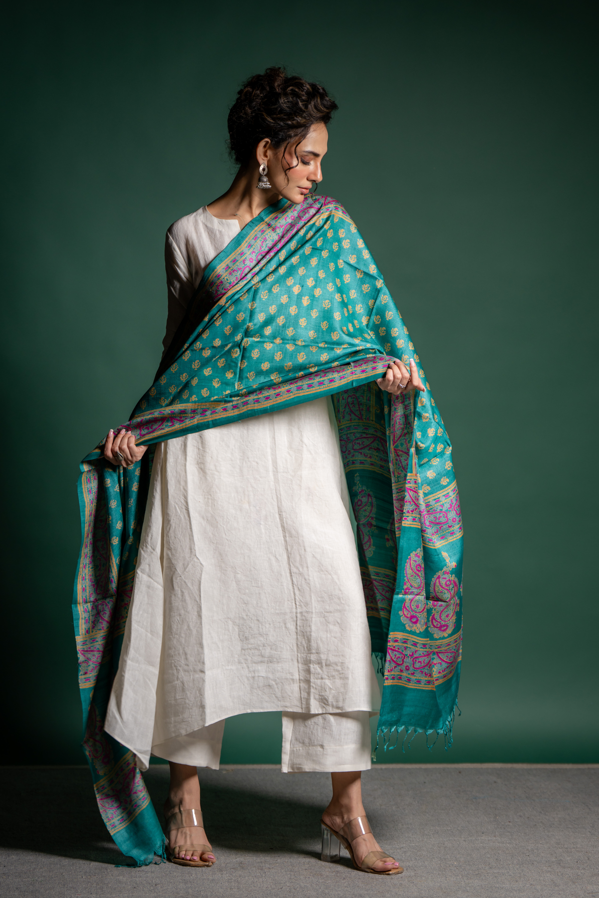Aqua Gulmohar Silk Dupatta: The Blooming Serenity of Handwoven Grace